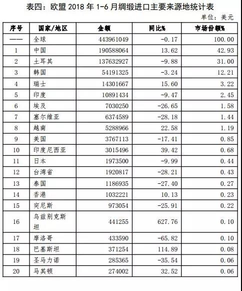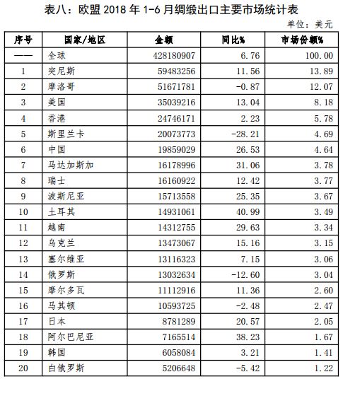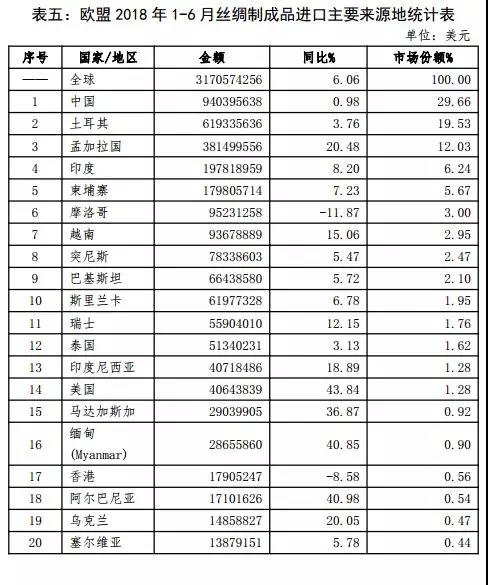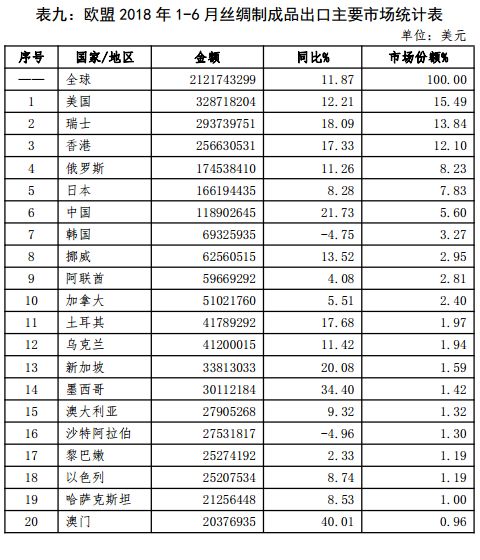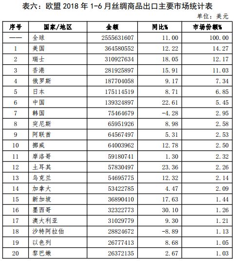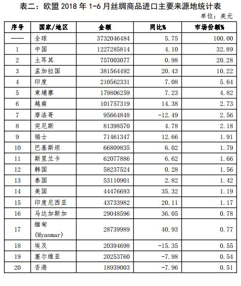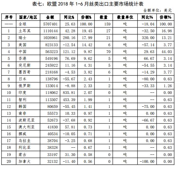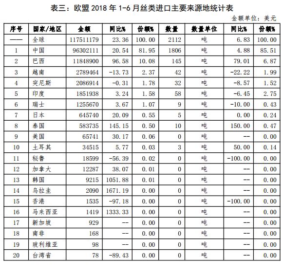 6月丝绸商品贸易情况 据欧盟统计局统计,6月丝绸商品贸易额为9.54亿美元,环比下降1.93%,同比下降2.53%。其中,进口额为5.63亿美元,环比下降4.85%,同比下降5.21%;出口额为3.91亿美元,环比增长2.61%,同比增长1.6%。具体商品构成情况如下: 进口:丝类金额为2228.21万美元,环比增长74.33%,同比增长25.55%,数量为377吨,环比增长45.56%,同比增长4.43%;绸缎金额为7192.6万美元,环比下降7.97%,同比下降12.56%;制成品金额为4.69亿美元,环比下降6.38%,同比下降5.09%。 出口:丝类金额为79.86万美元,环比下降28.64%,同比下降3.76%,数量为32吨,环比增长68.42%,同比下降62.79%;绸缎金额为6978.21万美元,环比下降3.17%,同比下降3.67%;制成品金额为3.21亿美元,环比增长4.08%,同比增长2.84%。 1-6月丝绸商品贸易情况 1-6月,欧盟丝绸贸易额为62.88亿美元,同比增长7.82%。其中,进口额为37.32亿美元,同比增长5.75%;出口额为25.56亿美元,同比增长11%。具体情况如下: 进口商品构成为丝类1.18亿美元,同比增长23.36%,数量2112吨,同比增长6.83%;绸缎4.44亿,同比下降0.17%;制成品31.71亿美元,同比增长6.06%。 进口主要来源地为中国(金额12.27亿美元,同比增长4.1%,占比32.89%)、土耳其(金额7.57亿美元,同比增长0.98%,占比20.28%)、孟加拉国(金额3.82亿美元,同比增长20.43%,占比10.22%)、印度(金额2.11亿美元,同比增长7.08%,占比5.64%)、柬埔寨(金额1.8亿美元,同比增长7.23%,占比4.82%。以上5个来源地合计占比为73.85%。 出口商品构成为丝类570.74万美元,同比增长25.63%,数量159吨,同比下降18.04%;绸缎4.28亿,同比增长6.76%;制成品21.22亿美元,同比增长11.87%。 出口主要市场为美国(金额3.65亿美元,同比增长12.22%,占比14.27%)、瑞士(金额3.11亿美元,同比增长18.05%,占比12.17%)、香港(金额2.82亿美元,同比增长15.91%,占比11.03%)、俄罗斯(金额1.88亿美元,同比增长9.17%,占比7.34%)、日本(金额1.75亿美元,同比增长8.71%,占比6.85%)。以上5个市场合计占比为51.66%。 表格目录 表一:欧盟2018年1-6月丝绸商品进出口商品结构统计表 表二:欧盟2018年1-6月丝绸商品进口主要来源地统计表 表三:欧盟2018年1-6月丝类进口主要来源地统计表 表四:欧盟2018年1-6月绸缎进口主要来源地统计表 表五:欧盟2018年1-6月丝绸制成品进口主要来源地统计表 表六:欧盟2018年1-6月丝绸商品出口主要市场统计表 表七:欧盟2018年1-6月丝类出口主要市场统计表 表八:欧盟2018年1-6月绸缎出口主要市场统计表 表九:欧盟2018年1-6月丝绸制成品出口主要市场统计表